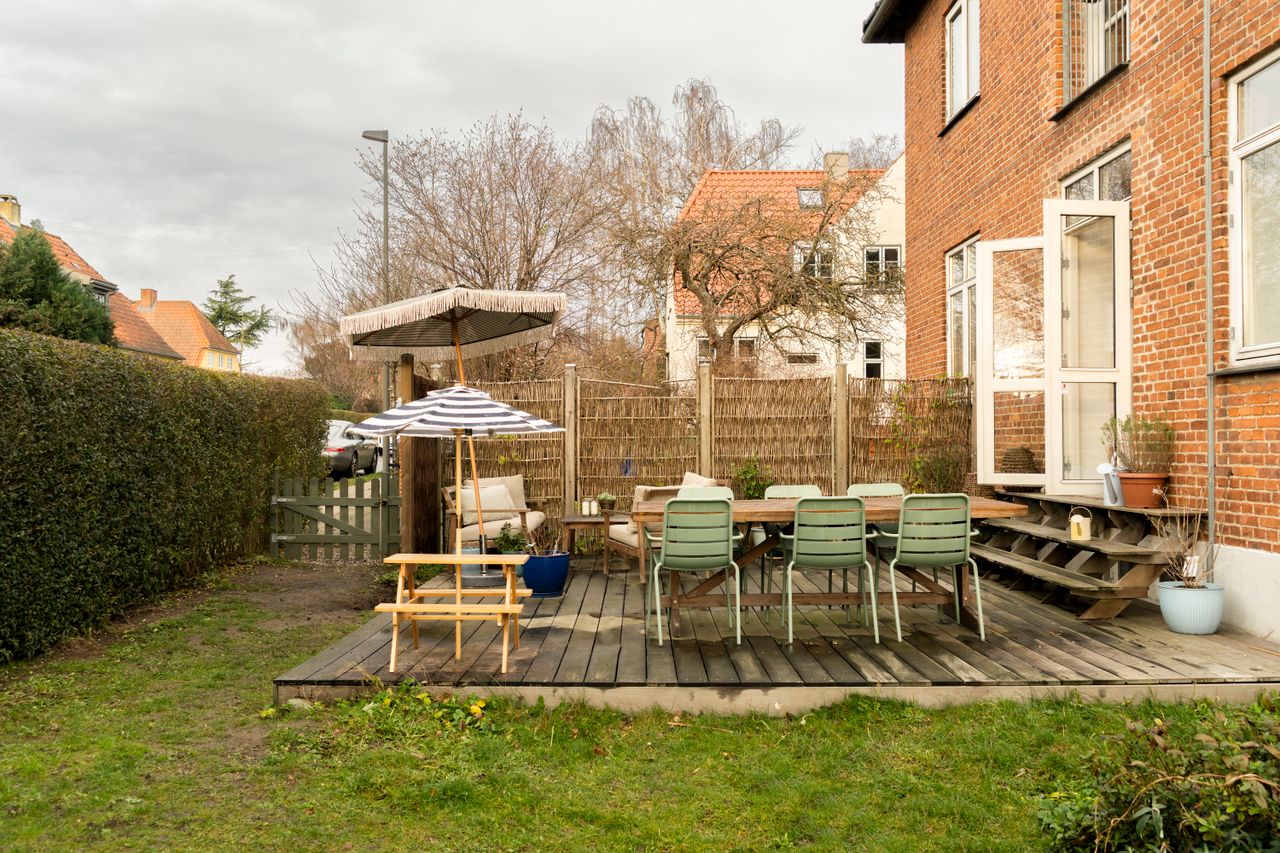 Lejligheden byder på 3 stuer en suite, udgang til haven fra hele to sider. Og haven er altså bare grøn og skøn! Og solrig. Og delt op så man ikke deler den med naboen. Det lækreste badeværelse med nyere terrazzogulv og to gode soveværelser (man bruger nok også den ene stue til soveværelse, så 3 i alt).