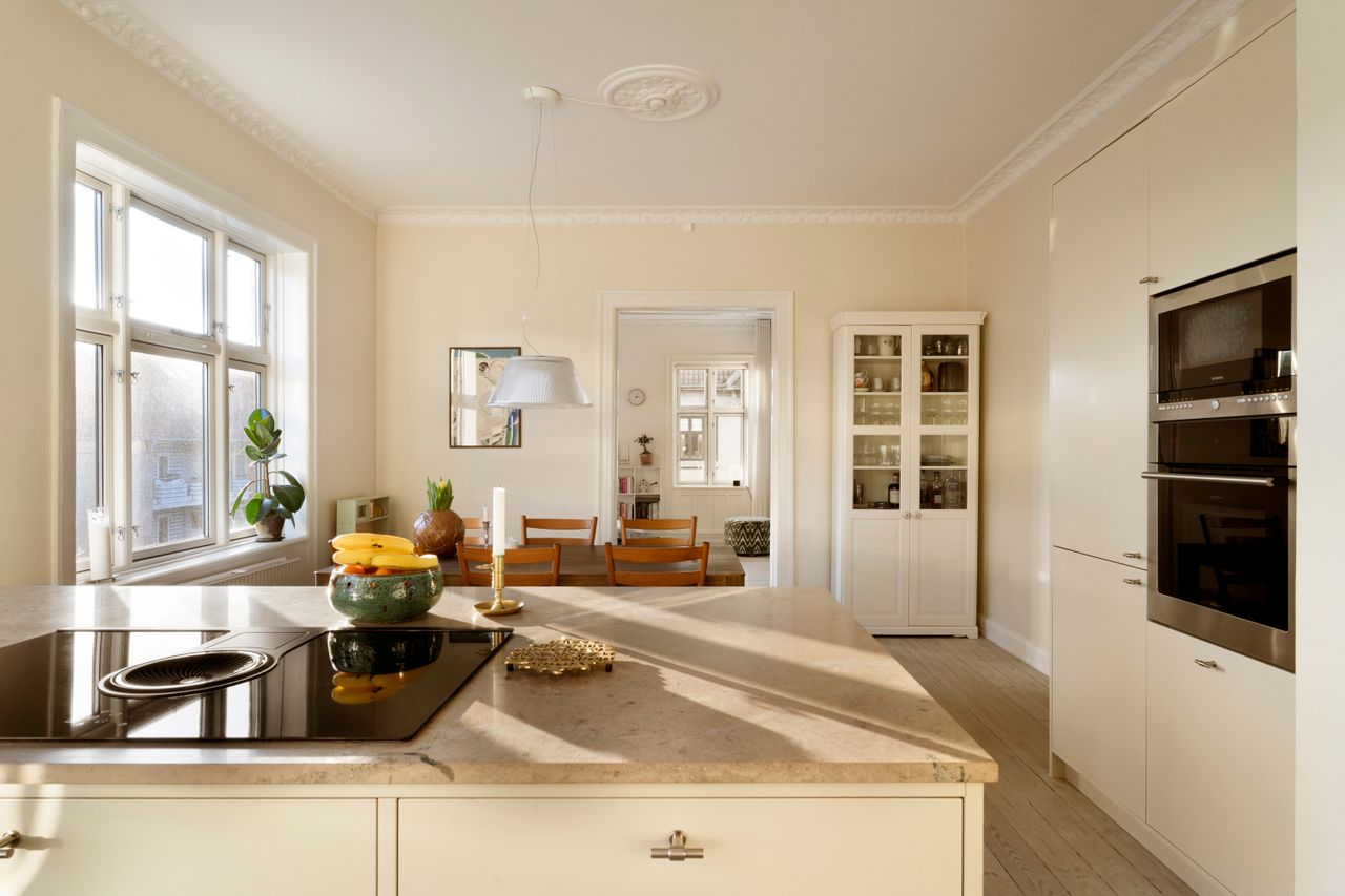 Et køkken-alrum i åben forbindelse med en elegant hjørnestue, hvor lyset får lov at danse dagen lang.