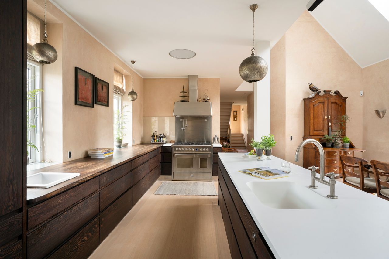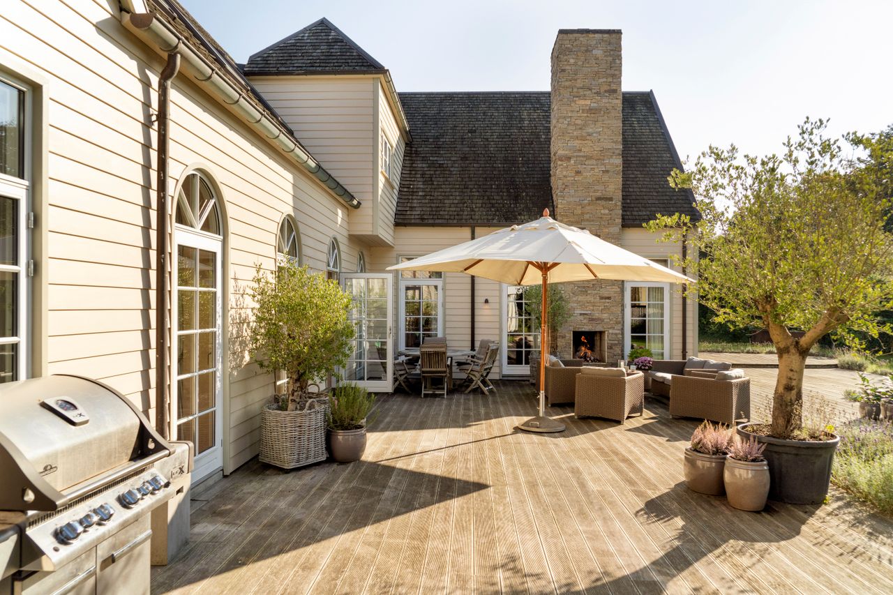 Den dejlige have er mindst lige så vidunderlig, og sammensmeltningen af hjem og have er som en drøm, der bliver til virkelighed. Her er virkelig muligheden for at leve et diskret liv med højt til loftet. Hjertet i midten af det hele er opholdsrummene. Stue og spisestue er den harmoniske duet, der får det hele til at spille. En symfoni af træ og gedigne materialer er gennemgående. Naturligvis er her både kontor, børneværelser, gæsteværelser og direkte udgang til en terrasse, der binder den fineste sløjfe på herligheden.